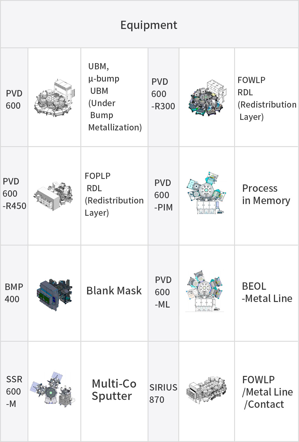 - ARES™ PVD600系统是用于沉积金属薄膜的Sputter设备,在适用倒装芯片(Flip-chip)技术的半导体封装工艺中可以进行用于CPB(Cu Pillar Bump)结构的输入/输出信号传输的UBM(UnderBump Metalization)工艺。